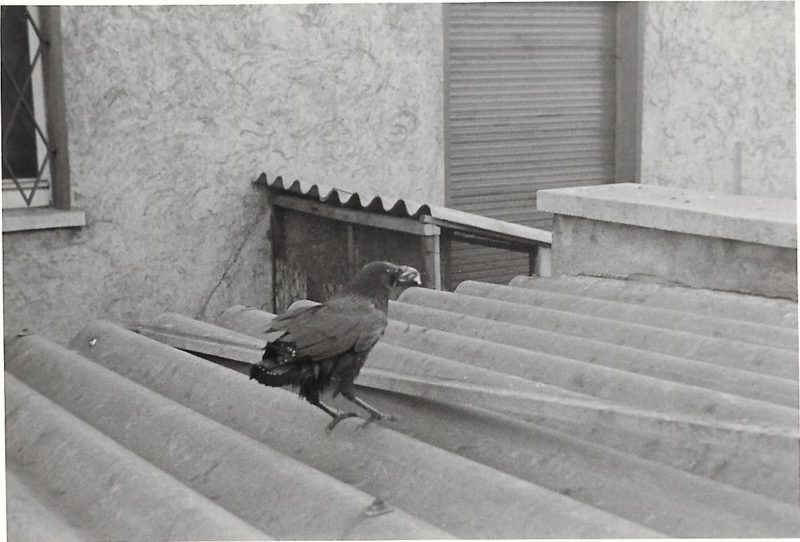 Eines Tages in den frühen 60ger Jahre spektakelte ein kleines schwarzes Etwas hinter unserem Haus an den Bahngeleisen; ein junger Rabe mit gebrochenem Flügel. Mein Vater schiente den Flügel passender Weise mit dem abgebrochenen Propeller eines seiner Modellflugzeuge.